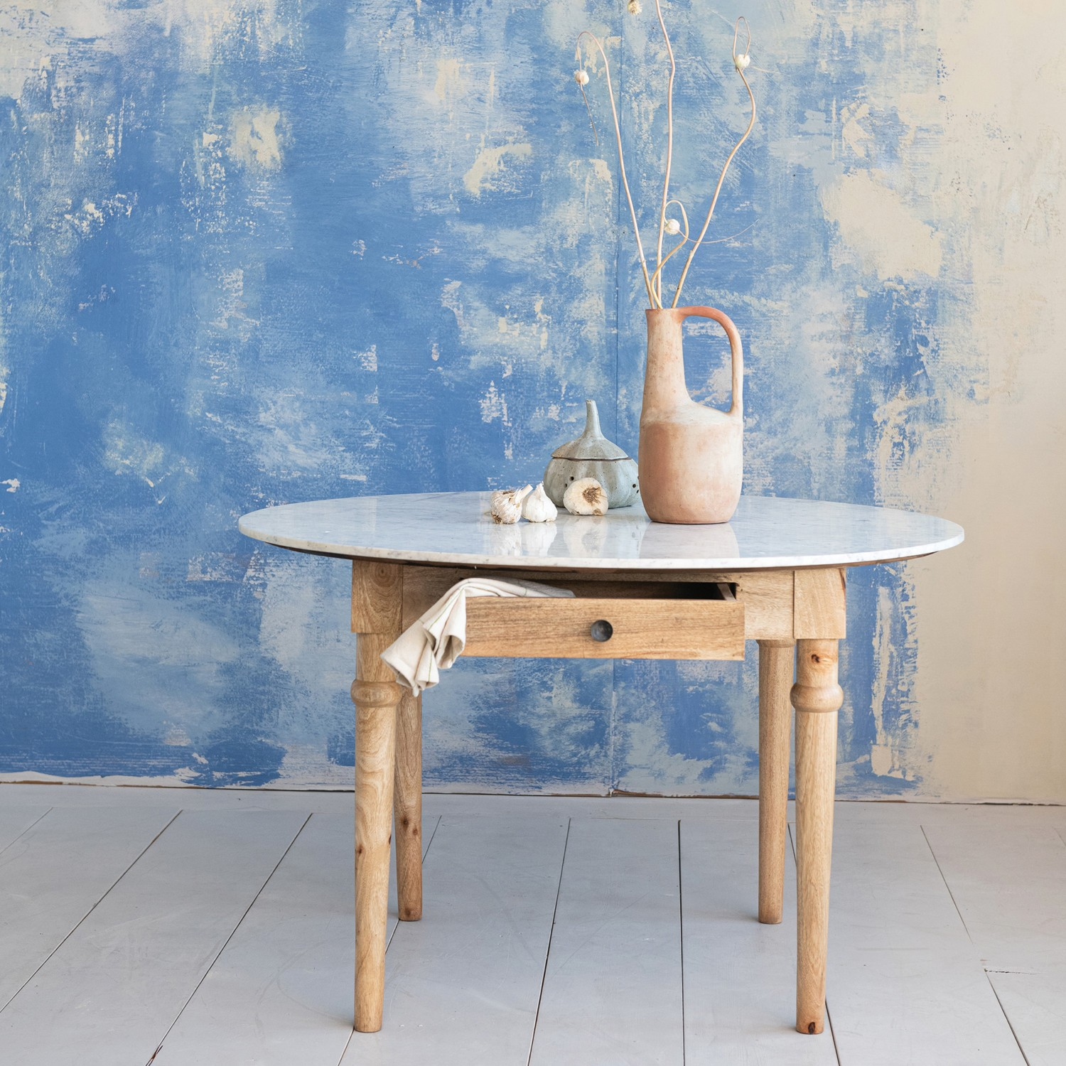 Solid wood table with a single drawer, and round marble top. This adorable table would be great for a small breakfast nook or as a kitchen island.