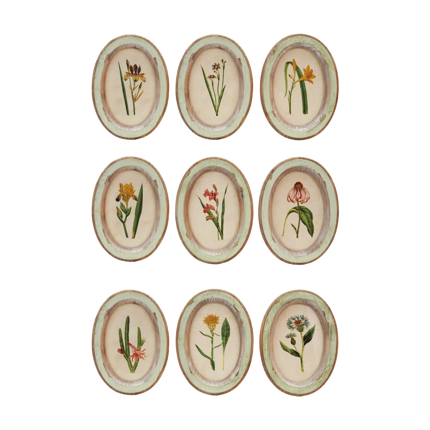 7-3/4"W x 10-1/2"H Oval Wood Framed Glass Wall Décor w/ Flower, Distressed Finish.
